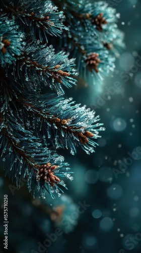Close-up of frosted evergreen branches during a winter snowfall at dusk