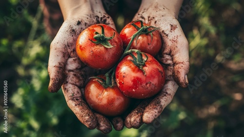 Close-up of gardener's hands gently hold ripe, red tomatoes freshly picked from the lush green plant