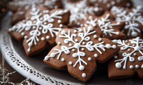 Close-up of Gingerbread Cookies with Snowflake Frosting