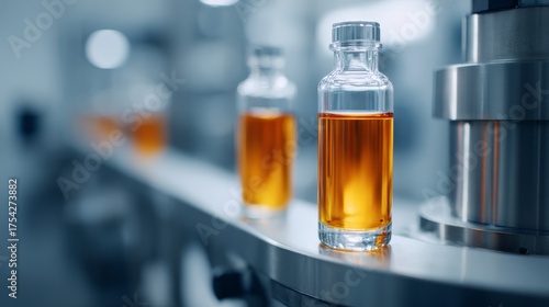 Closeup of glass vials filled with essential oils on a sterile production line with soft clinical lighting and white surfaces, highlighting natural wellness manufacturing