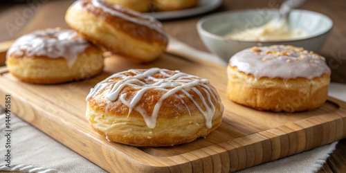 "Close-Up of Glazed Donuts with White Icing – Freshly Baked Pastries on Wooden Board"