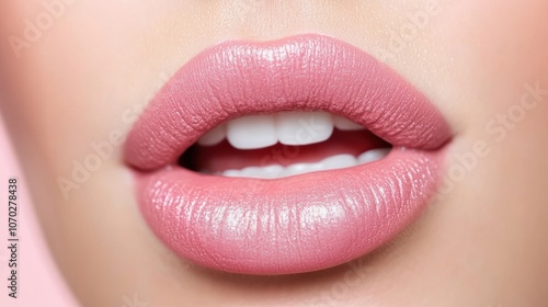 Close-up of glossy pink lips showcasing smooth texture and vibrant color, AI