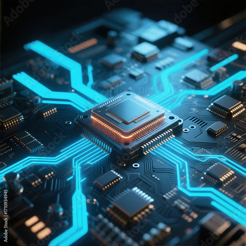 Closeup of glowing circuit with blue chip concept for electronics and digital technology illustration