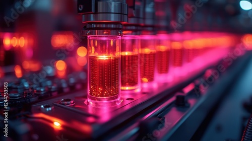 Close-up of glowing test tubes in a high-tech laboratory showcasing advanced research processes