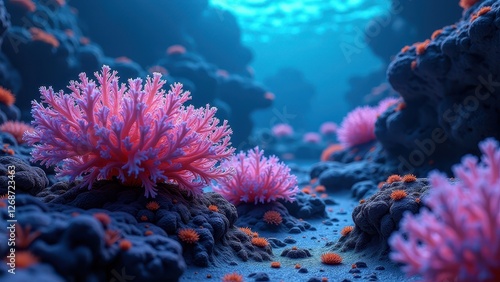 Close-up of glowing underwater coral with bioluminescent anemones in deep sea