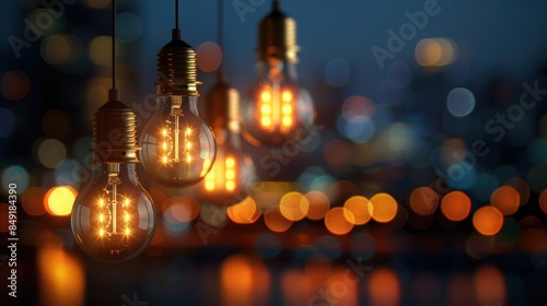 Close-up of glowing vintage light bulbs hanging in front of a bokeh-blurred cityscape, combining urban ambiance with nostalgic lighting.