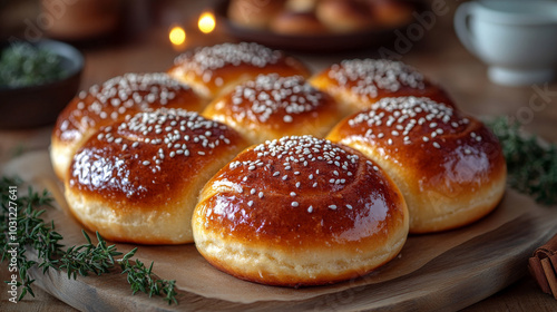 Close-up of golden brown rolls topped with sesame seeds.