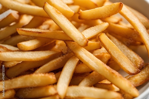 Close-up of golden, crispy French fries in a white bowl, with a simple, blank background. The fries are neatly arranged, showcasing their texture and color.