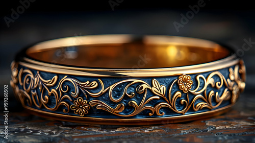 Closeup of Golden Floral Design on a Blue Ring - Macro Photography