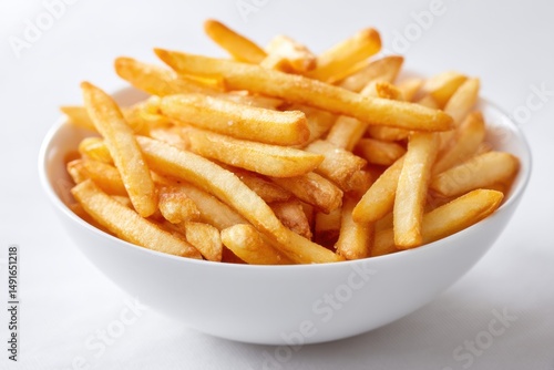 Close-up of golden French fries in white bowl on clean white background studio shot of fried potatoes snack food