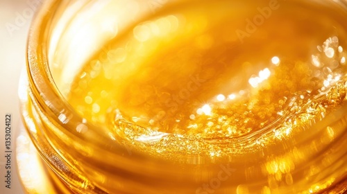 Close-Up of Golden Honey in Jar with Soft Reflection and Warm Lighting