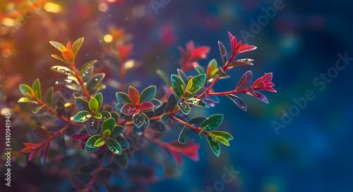 Close-up of Green and Red Leaves with Water Droplets in Nature