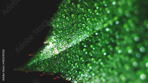 Close-up of green leaf with water drops on black background. Natural concept. Abstract botanical and ecological wallpaper with selective focus and blurred bokeh lights. Macro details