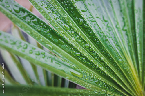 close-up of green palm leaves with rain drops shot after a tropical rain from a chinese fan palm