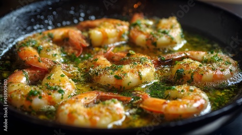 Close-up of grilled shrimp in a pan, with herbs and spices for a flavorful meal.