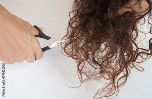 Close-up of hairdresser cutting long hair with scissors