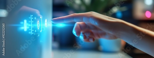 Close-Up of Hand Adjusting a Smart Speaker with LED Indicators in a High-Tech Kitchen