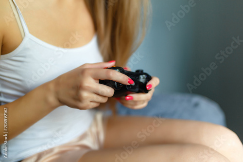 Close-up of hand blonde girl with gamepad in hand playing video games console while lying on the bed. The girl is out of focus, holding the joystick of her video console while playing video games.