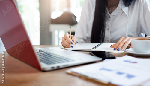 Close-up of hand businesswoman writing on notepad while she working with computer laptop and smart phone on desk