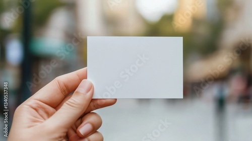 Close-up of hand holding a blank white card with a blurred background. Perfect for ID, business card, or membership card mockups.