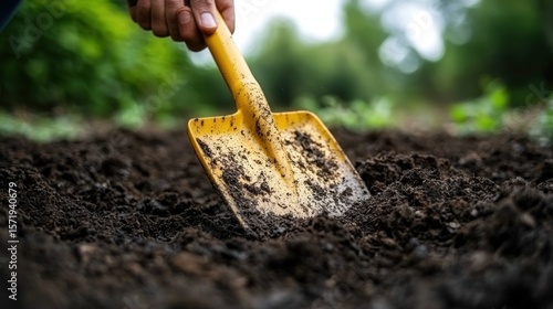 Close-up of hand holding yellow shovel, digging into dark rich soil