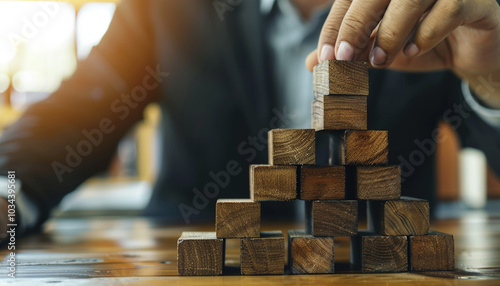 Close-up of hand laying wooden blocks, copy space, business development concept, illustration of new ideas promotion.