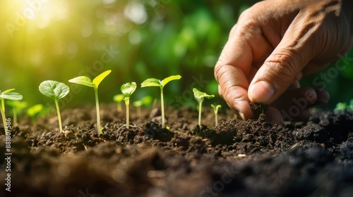Close-Up of Hand Planting Seedlings in Soil with Sunlight - Gardening and Agriculture Concept