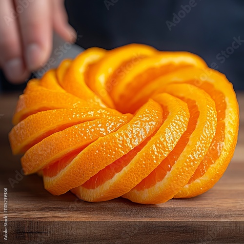Close-up of hand slicing orange into spiral on wooden board.
