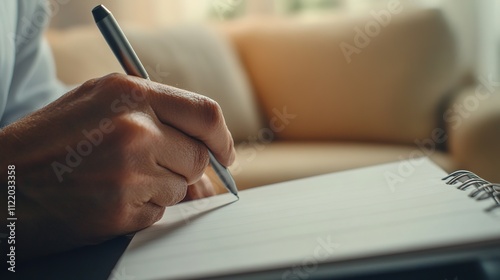 Close-up of hand writing in notebook with pen, warm tones