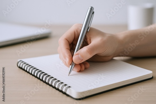 Close-up of hand writing in spiral notebook with silver pen, on a neutral colored desk