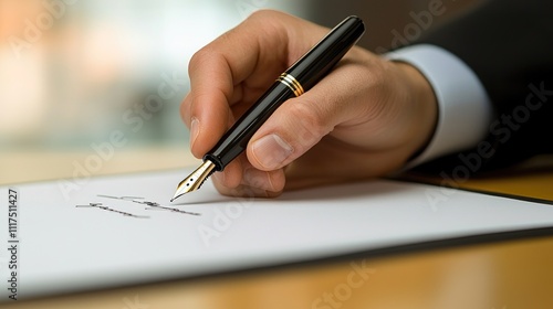 Close-Up of Hand Writing with Elegant Fountain Pen on White Paper in Professional Office Setting