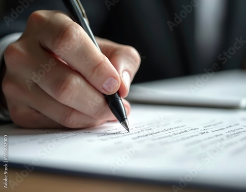 Close-up of hand writing with pen on document in office setting. Professional workplace concept. Man signs contract with signature. Business agreement.