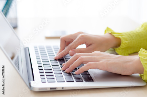 Closeup of hand young asian businesswoman working on laptop computer on desk at home office, freelance looking and typing on notebook on table, woman studying online, business and education concept.