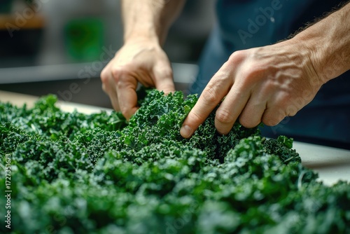 Close-up of hands carefully inspecting a large quantity of fresh, vibrant green kale.
