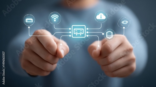 Closeup of hands connecting ethernet cable semitransparent overlay of suspended networking icons router cloud shield IT infrastructure cybersecurity concept