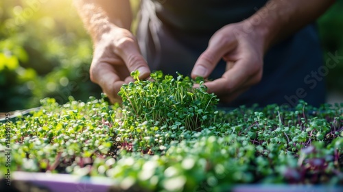 Closeup of Hands Gently Holding Microgreens Seedlings in a Tray