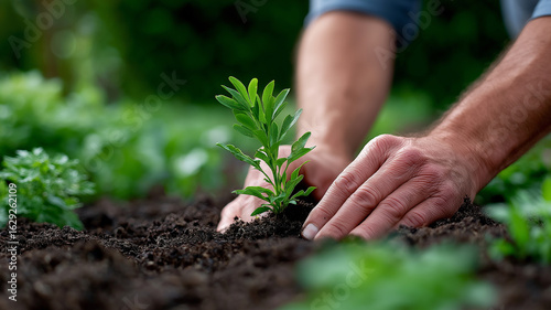 Close-Up of Hands Gently Planting Young Tree in Natural Soil Surrounded by Eco-Friendly Garden Items and Soft Sunlight Symbolizing Environmental Responsibility