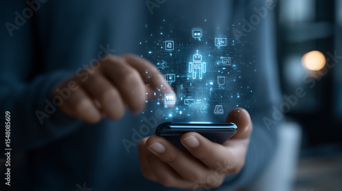 Close-up of hands holding a mobile phone with a digital icon for artificial intelligence