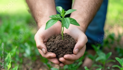 Close-up of hands holding a small green plant with soil, symbolizing growth, nature, and new beginnings.