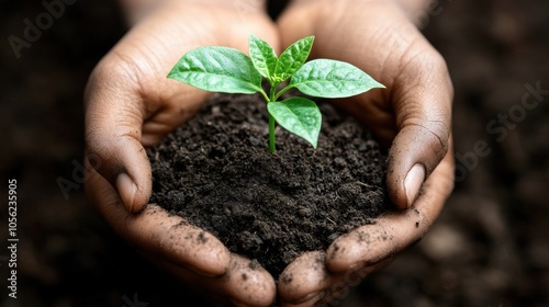 Close-up of hands holding a small plant sprouting from soil, symbolizing growth and environmental consciousness.