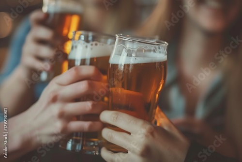Close-up of hands holding beer glasses, toasting together in a spirited group celebration.