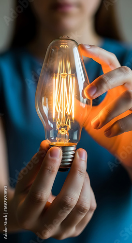 Closeup of Hands Holding Illuminated Edison Style Light Bulb Warm Yellow Light Teal Background Edison bulb