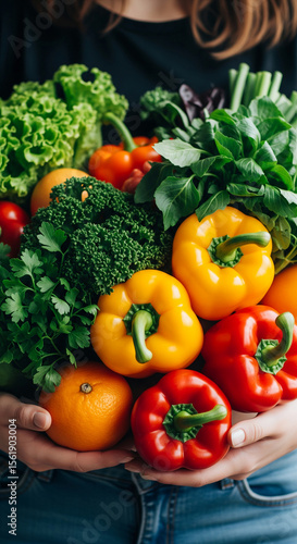 Close-up of hands holding various fresh vegetables and citrus fruit, showcasing vibrant colors and healthy eating concept