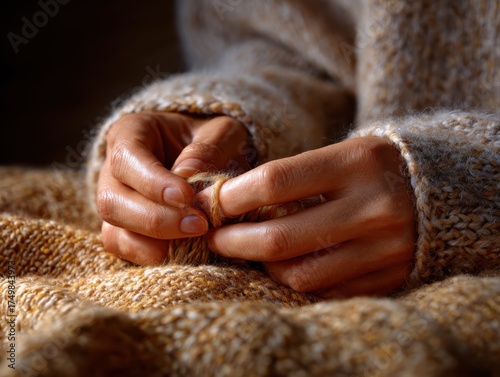 Close-up of hands in a warm knitted sweater holding wool yarn, symbolizing comfort, warmth, and handmade craftsmanship in a cozy autumn or winter setting.