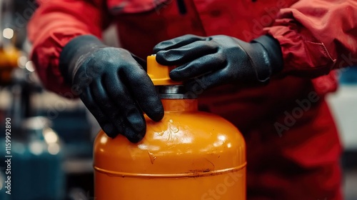Close-up of hands in black gloves holding an orange cylinder. A worker dressed in a red jacket is using it to fill a gas canister at the factory. The focus is on the hand and body position