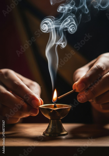 closeup of hands lighting incense stick from burning diya oil lamp. aromatic smoke curls upwards. concept of spiritual ritual, meditation, and peace. diwali celebration.