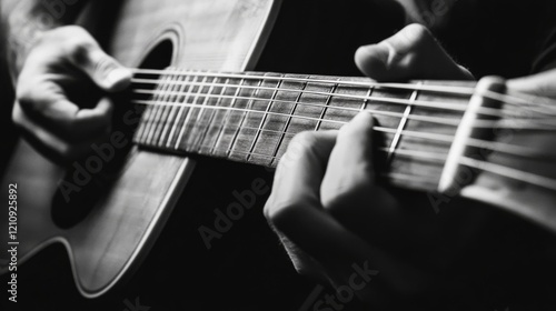 Close-up of hands playing acoustic guitar.