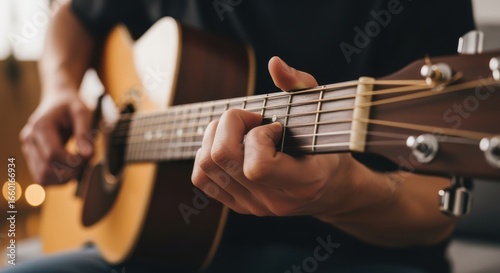 Closeup of hands playing an acoustic guitar focusing on finger placement to illustrate musical chord techniques with a warm and inviting background suitable for articles about