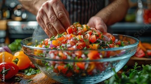 Close-up of hands preparing fresh salad in bowl with modern kitchen background
