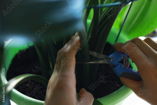 Close-Up of Hands Pruning Indoor Plant in Green Pot with Blue Shears